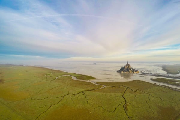 Drohnenfotograf Jeremie Eloy hat den Berg Mont-Saint-Michel in der Normandie während einer Flut im Januar aufgenommen, die ihn zu einer Insel hat werden lassen.