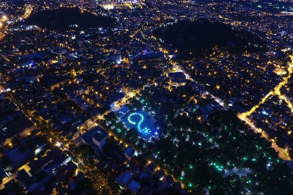 Svetlin Marinov hat die Stadt Plovdiv in Bulgarien bei Nacht von oben fotografiert. Sie soll die älteste Stadt Europas sein, die immer noch bewohnt und am selben Ort ist. Das große Fragezeichen im Bild sind Springbrunnen, die von Musik begleitet werden.