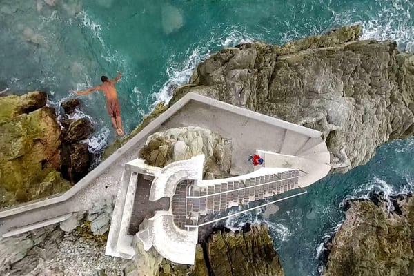 Mexikanische Klippenspringer stürzen sich jeden Tag am Plazuela Sanchez Taboada in Mazatlan von der Aussichtsplattform ins Meer um ein paar Pesos von Touristen zu ergattern. Alejandro Ochoa hat einen dieser eindrucksvollen Momente mit seiner Drohnenkamera eingefangen.