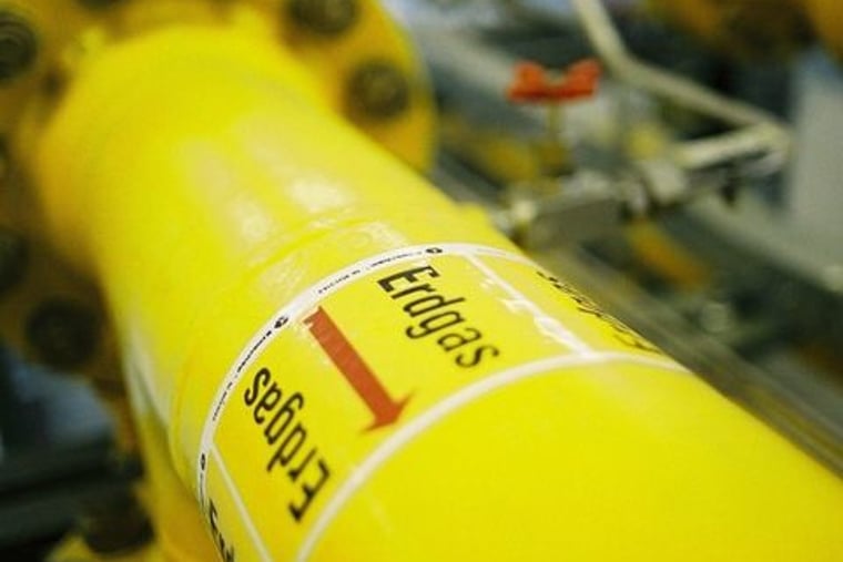Auf einer RWE-Erdgasleitung klebt ein Aufkleber, auf dem "Erdgas" steht
