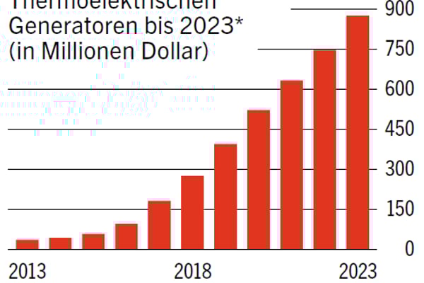 Wegen der raschen technischen Fortschritte erwarten die Analysten des Marktforschers IDTechEx ein starkes Umsatzwachstum. Sie glauben, dass TEG-Hersteller 2023 weltweit 875 Millionen Dollar umsetzen werden – ein Anstieg auf das 25-Fache gegenüber rund 35 Millionen Dollar im vergangenen Jahr (siehe Grafik).