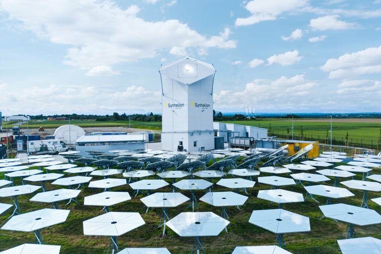In Jülich zeigt sich im Kleinen, wie sich dieser Sprit mit Solarenergie herstellen lässt. Die neue Anlage von Synhelion ähnelt einem Solarthermiekraftwerk, wie es etwa in der Mojave-Wüste nahe Las Vegas in Betrieb ist: Unzählige bewegliche Spiegel reflektieren das Sonnenlicht auf einen kleinen Bereich an der Spitze eines Turms. Dort wird die Hitze üblicherweise genutzt, um Dampf zu erzeugen und eine Stromturbine anzutreiben.