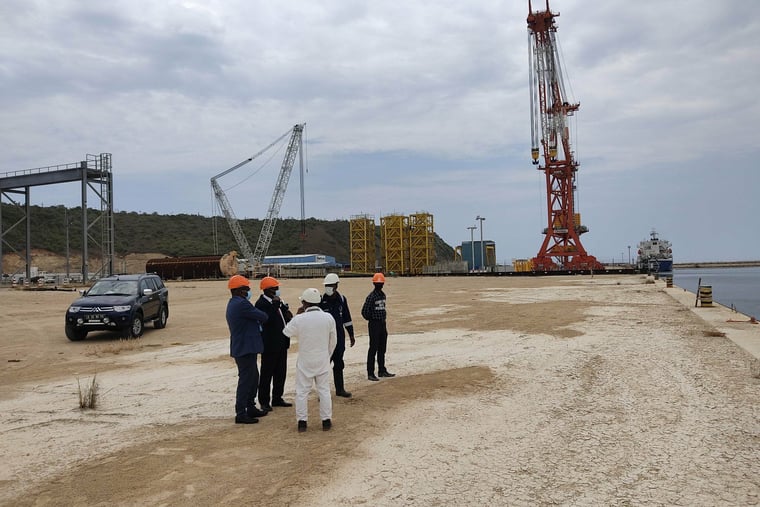 Angola, Lauce: Bauarbeiter stehen auf dem Gelände des Hafens Barra do Dande, der derzeit im Bau befindlich ist. Auf der Fläche dieses Hafens soll auch eine Elektrolyseanlage durch die deutschen Firmen Gauff und Conjuncta in Kooperation mit Sonangol, größter Ölkonzern Afrikas, gebaut werden.