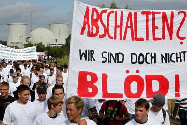 Einige hundert Auszubildende von Energieversorgern demonstrieren im September 2009 vor dem Atomkraftwerk Biblis für Atomkraft und gegen den Atomausstieg