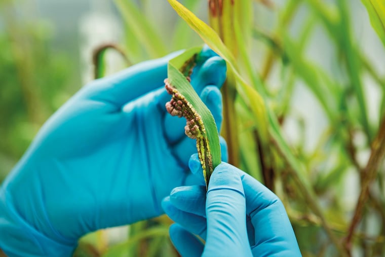 Die Erntehelfer: Forscher suchen Sorten, die unter Dürre oder Schädlingen weniger leiden als diese an einem Pilzerkrankte Maispflanze