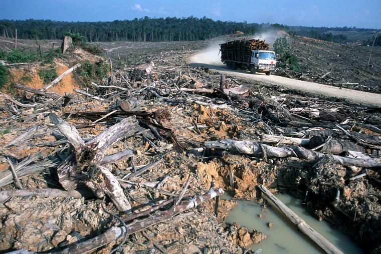 Das Handout der Umweltschutzorganisation WWF zeigt die illegale Abholzung eines Waldgebietes in Sumatra (Indonesien). Jährlich gehen knapp 5,6 Millionen Hektar Wald verloren. Die fortschreitende Abholzung von Regenwäldern trägt entsprechend mit zur globalen Erderwärmung bei. Denn die Wälder speichern Kohlendioxid.