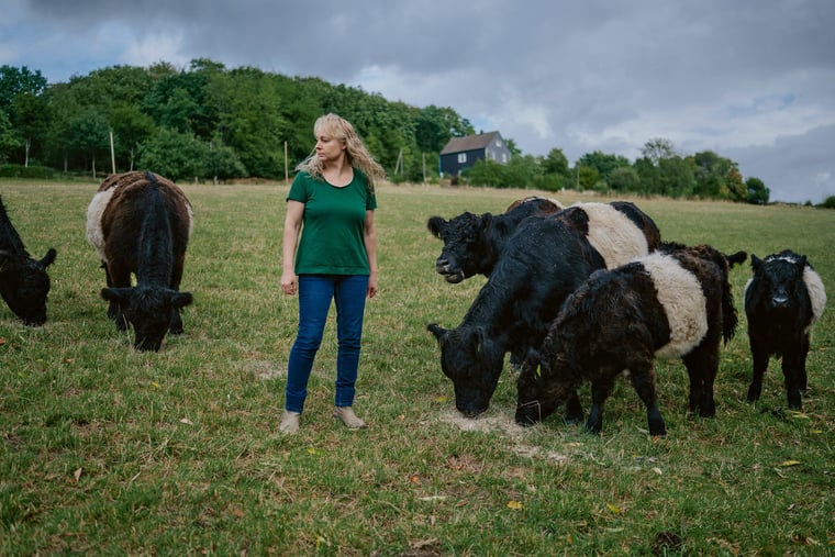 Von der Wiese auf den Teller: Züchterin Birgit Hütter setzt auf Belted-Galloway-Rinder, die dem Klima weniger schaden als Tiere die Kraftfutter erhalten