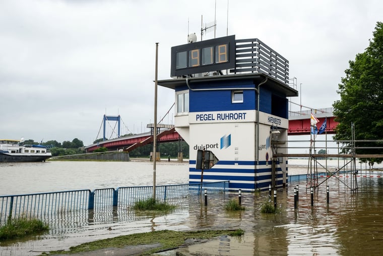 Auf über neun Meter stieg der Wasserstand am Freitagnachmittag an diesem Pegelhaus in Duisburg. Andernorts in Nordrhein-Westfalen sah die Lage sogar noch schlimmer aus.