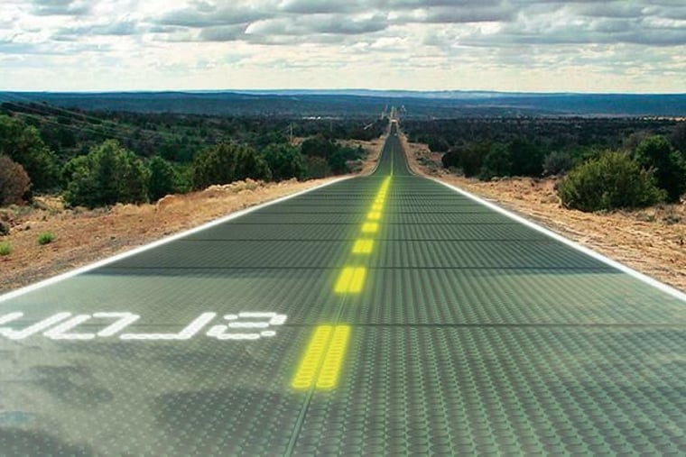 Das US-Startup Solar Roadways hat ein 13 Quadratmeter großes Solar-Straßenteil gebaut, das mit LEDs Warninfos anzeigt. Andere Unternehmen arbeiten an Straßen, die Energie durch den Druck rollender Autos erzeugen. Foto