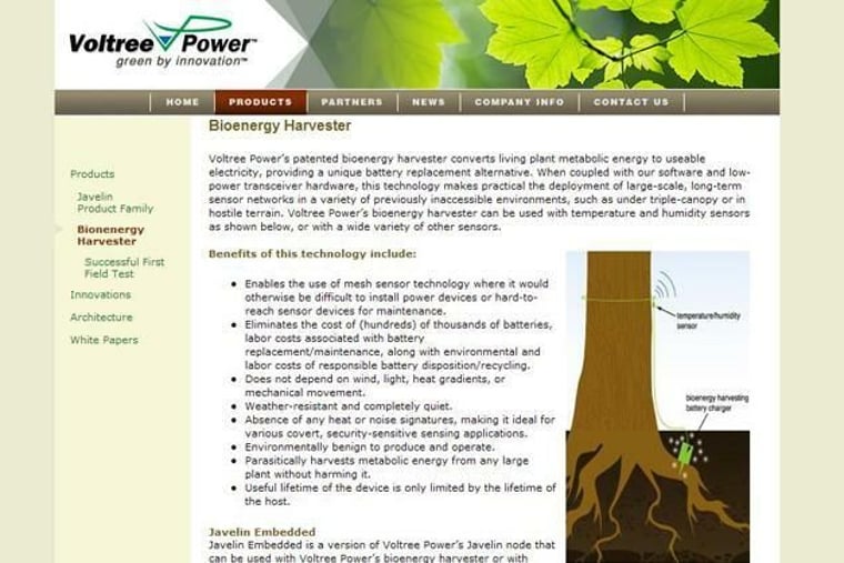 Sogar Bäume geben Strom ab, und das US-Startup Voltree Power weiß, wie: Mit zwei Elektroden, in die Baumwurzel und den Boden daneben gesteckt, nutzen die Amerikaner den Unterschied zwischen den PH-Werten beider Umgebungen, um eine elektrische Spannung zu erzeugen und Strom zu produzieren - wie bei einem Apfelradio. Der soll reichen, um kleine Status-LEDs zu betreiben oder Uhren für Sensornetzwerke.