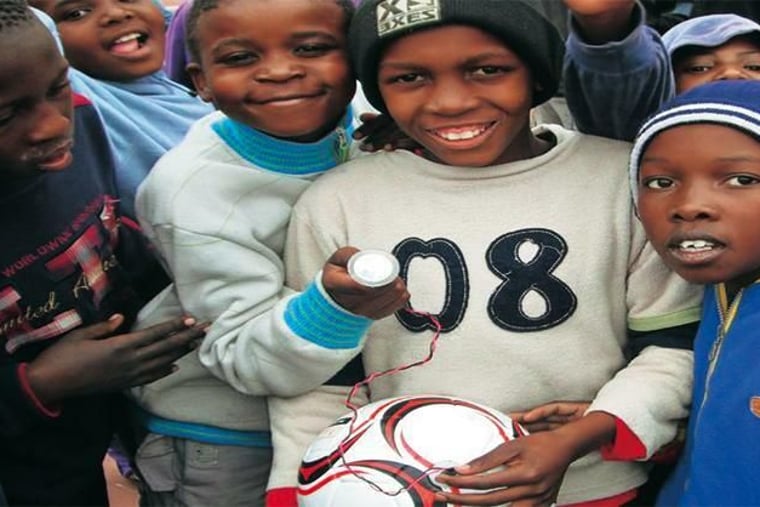 Spielend Strom erzeugen können Kinder in Afrika bald mit dem Soccket-Fußball des US-Anbieters Uncharted Play. Ein eingebauter Dynamo speist bei Stößen Strom in einen Akku, der via Stromkabel eine LED zum Leuchten bringt.
