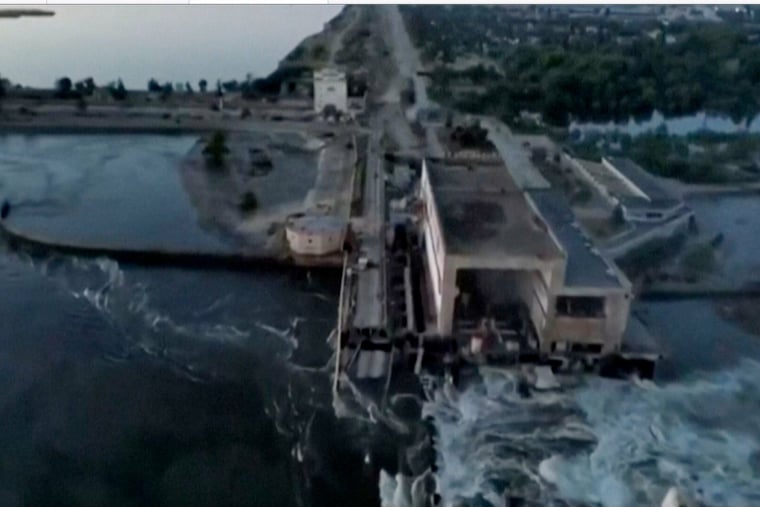 Dieses vom ukrainischen Präsidialamt über AP veröffentlichte Videostandbild zeigt den beschädigten Kachowka-Staudamm in der Nähe von Cherson.