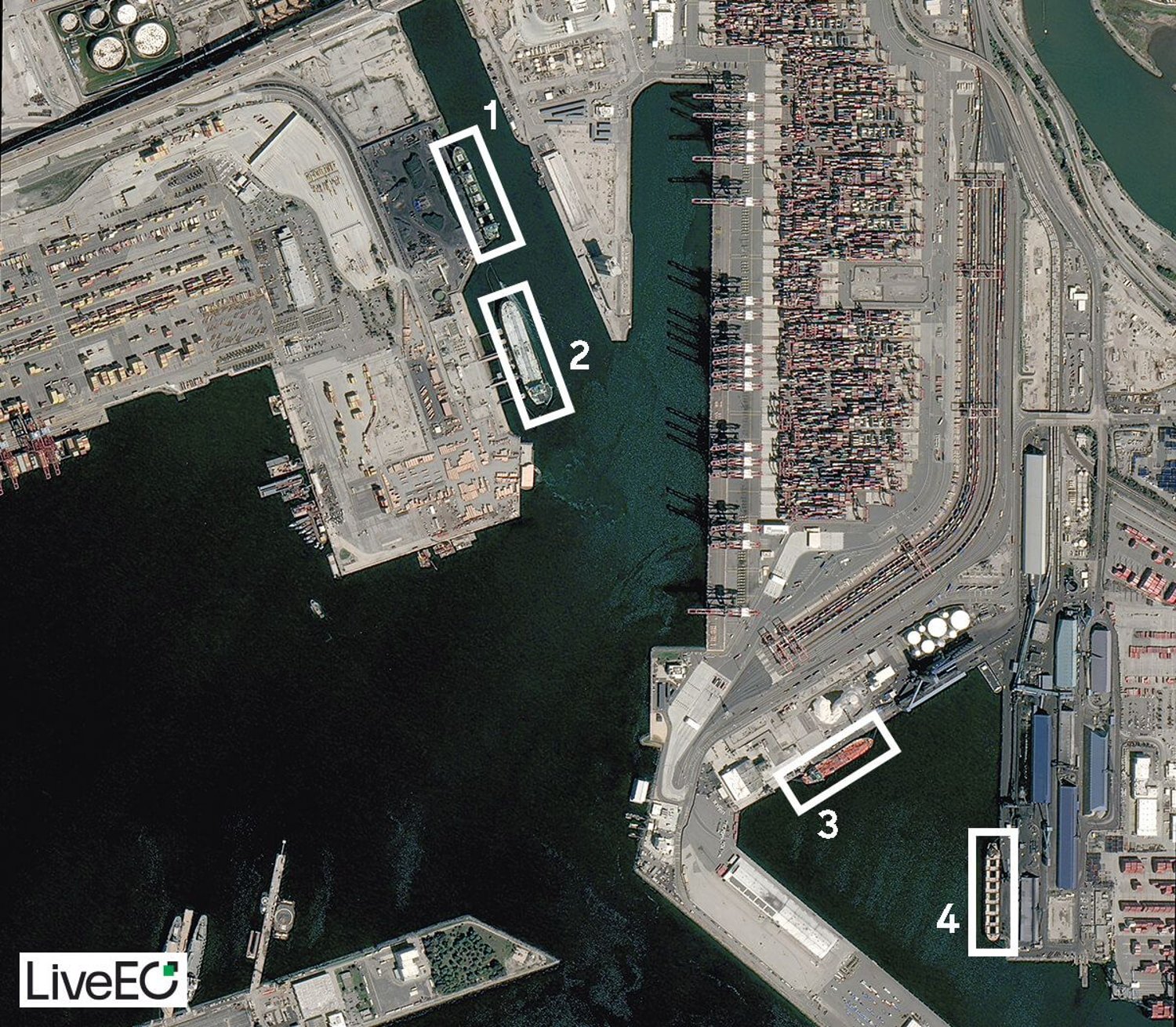 19.03.2025: Im Hafenbecken zeigt sich die Bedeutung der zusätzlichen Gebühren: Die BBG Beihai (1) gehört der BG Shipping, einem Reeder aus Hongkong. Das Bulkschiff wurde von der CSSC in China gebaut. Die Öltanker Atlantic Gold (2) und Celsius Philadelphia (3) wie auch Bulkschiff Ocean Dalian (4) kommen aus der chinesischen Provinz Jiangsu, nahe Shanghai. Sie gehören unterschiedlichen Reedereien aus Singapur, welche für ihre Schiffe zahlen müssten.