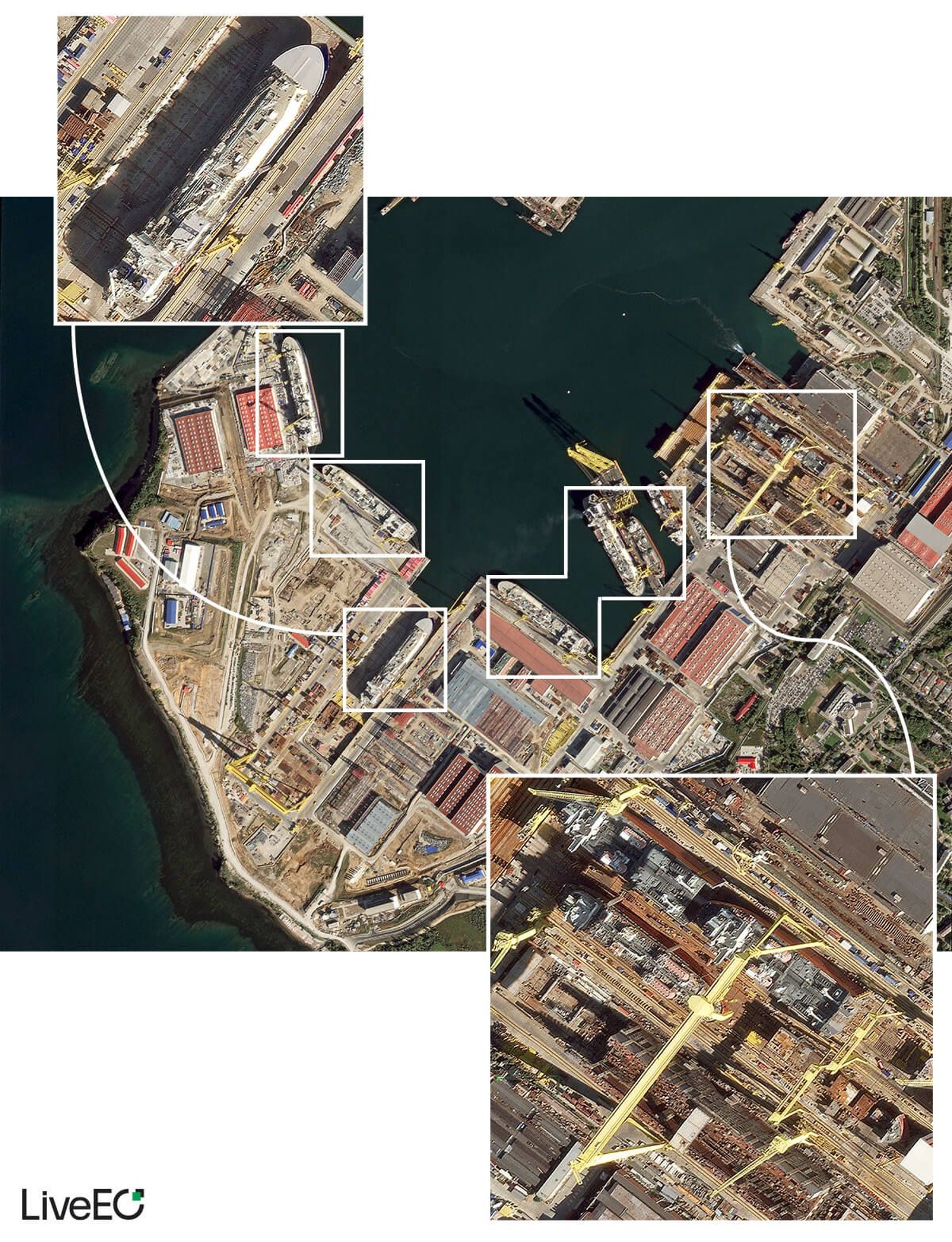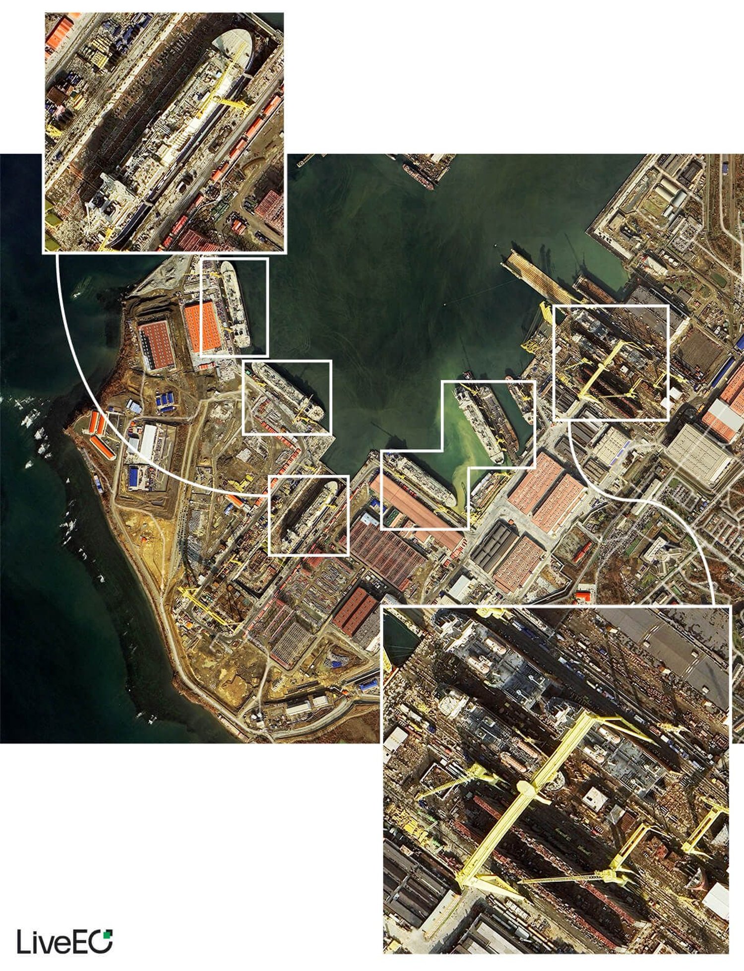 Neue eisbrechende LNG-Tanker in der Swesda-Werft bei Wladiwostok. Sie sollten schon längst unterwegs sein. Foto: LiveEO/Google Earth/Airbus