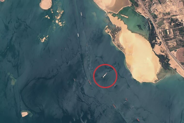 18.05.2021: Der Verkehr im Suezkanal fließt wieder, nur die im Bild rot eingekreiste „Ever Given“ darf nicht weiterfahren.