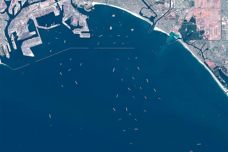 So wie hier vor Los Angeles und Long Beach stauen sich derzeit vor den Häfen überall auf der Welt die Containerschiffe.