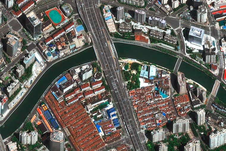 Die zur Inneren Ringstraße gehörende Nanpu-Brücke mit ihrer markanten Kreiselauffahrt gilt als eine der wichtigsten Verbindungen in den neuen Shanghaier Stadtteil Pudong, wo in den vergangenen Jahrzehnten riesige Wolkenkratzer entstanden sind. Auch sie ist eigentlich ein Ort, an dem der Verkehr dicht an dicht verläuft, sich häufig staut. Und auch hier zeigen Satellitenbilder aus den vergangenen Tagen und Wochen nahezu kein Auto.