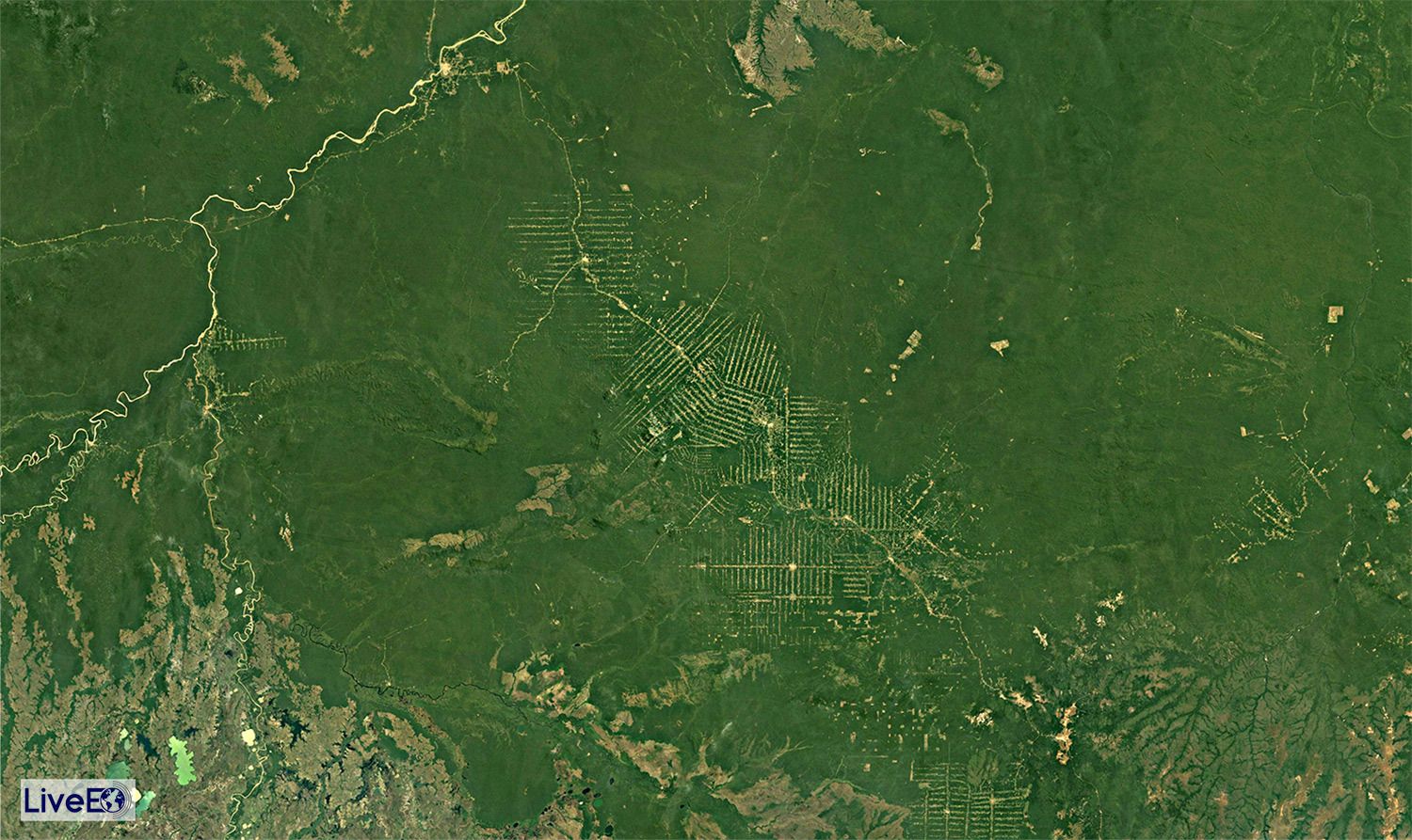 Das Muster der Erschließung ist stets ähnlich: Zunächst werden Schneisen für Straßen geschlagen, die wie schmale Streifen auf den Fotos erscheinen. An diesen Wegen entstehen dann größere Anbauflächen.