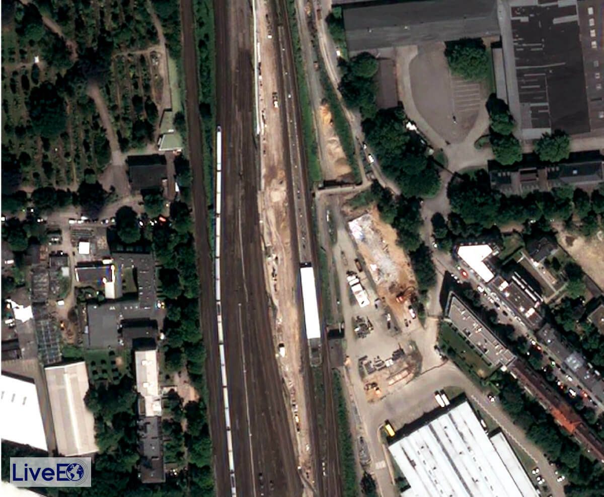 Die Bahn gibt an, durch den Umzug würden am ursprünglichen Standort 138.000 Quadratmeter Fläche frei. Die Satellitenbilder zeigen, wie ringsherum bereits neue Quartiere entstanden sind, mit Wohnungen und Einkaufsmöglichkeiten.