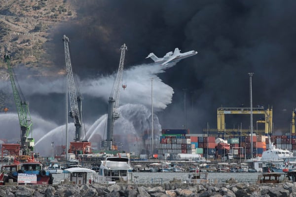 Noch am Mittwoch kippten Einsatzkräfte aus Flugzeugen Löschmittel auf das Hafengelände.