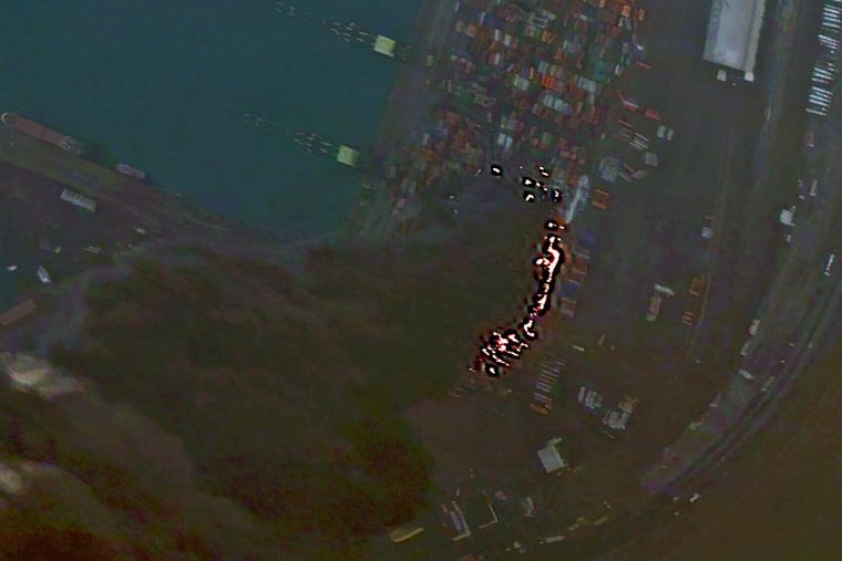Satellitenaufnahmen und Videos zeigen Hunderte umgekippte, brennende Container und dicke Rauchschwaden. Die Löscharbeiten dauerten mehrere Tage.