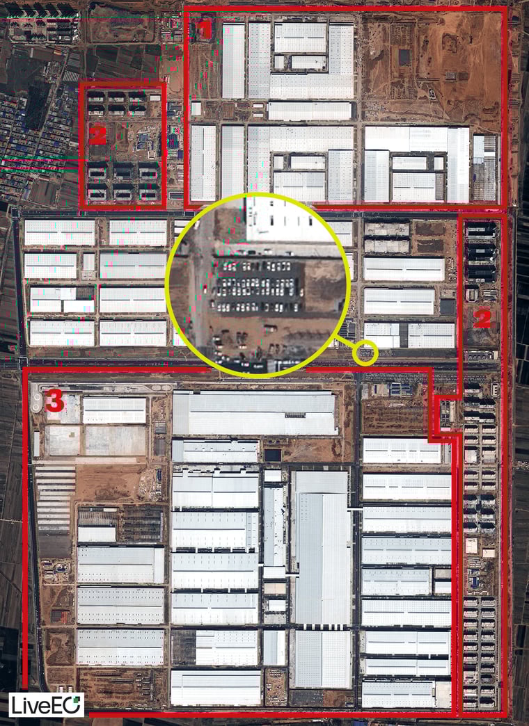 Ein hochaufgelöstes Satellitenbild zeigt um die 50 Wohnheimblocks für Arbeiter, die das Gelände säumen. Es ist eine regelrechte Stadt, die sogar ihr eigenes Klärwerk besitzt. Der Standort besteht dabei nicht nur aus dem Autowerk, sondern auch aus drei nahezu identischen Batteriefabriken, die aus dem All betrachtet an eckige Hufeisen erinnern.