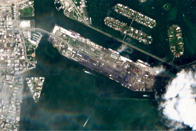 Die Satellitenbilder zeigen eindrucksvoll, wie Ende März 2020 gleich neun der mehrere Hundert Meter langen Schiffe im Hafen von Miami parken. Der Verkehr war zu diesem Zeitpunkt eingestellt. Bei normalem Betrieb wie Ende August dieses Jahres liegen meist drei bis fünf Schiffe vor Ort.