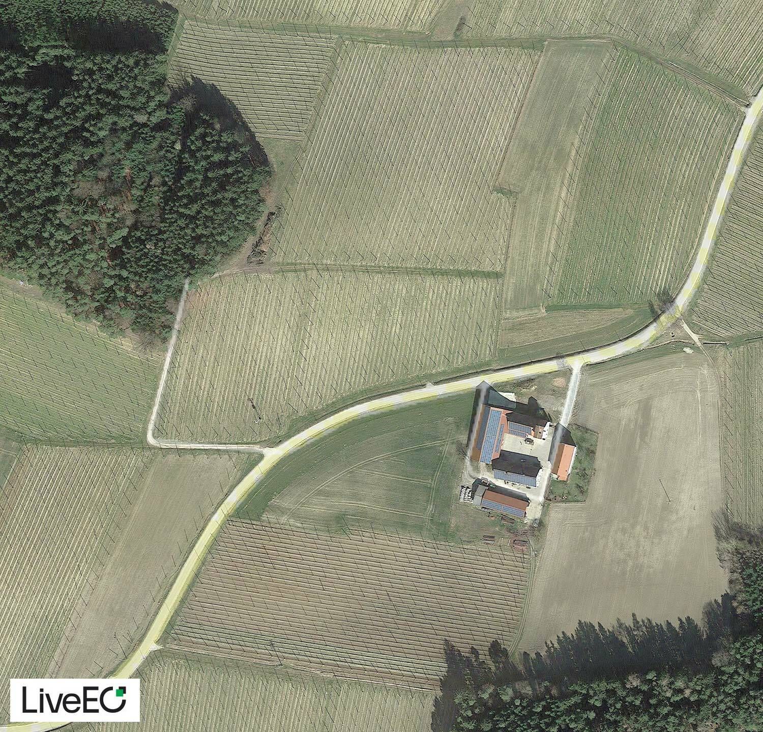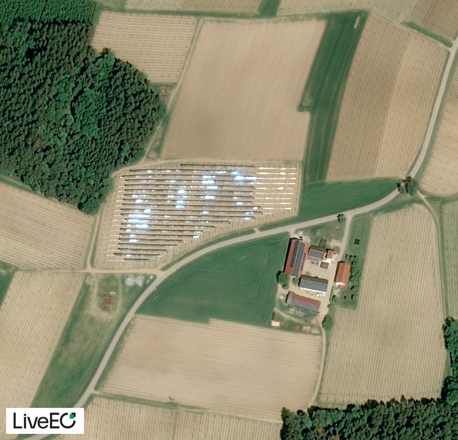 Hopfenpflanzer Josef Wimmer aus Neuhub hat dort vor eineinhalb Jahren robustere Stangen aufgebaut – und dann Solarmodule daran montiert. Exklusive Satellitenbilder von LiveEO zeigen die Module aus dem All, in denen sich das Sonnenlicht spiegelt.