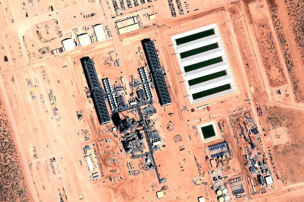 Die derzeitige US-Regierung will das mit einem Steuernachlass von 130 Dollar je im Rahmen von Enhanced Oil Recovery verpresster Tonne CO2 belohnen. Stratos soll jährlich eine halbe Million Tonnen einlagern – macht 65 Millionen Dollar Steuergutschrift. Ein aktuelles hochaufgelöstes Satellitenbild zeigt den Aufbau der Anlage. In der wird künftig zuerst Luft mit riesigen Ventilatoren angesaugt, in einer speziellen Flüssigkeit dann das CO2 der Luft gebunden, anschließend in einem chemischen Verfahren an feste Pellets angeheftet. Und von denen wird es durch Erhitzen abgelöst und kann verpresst werden.