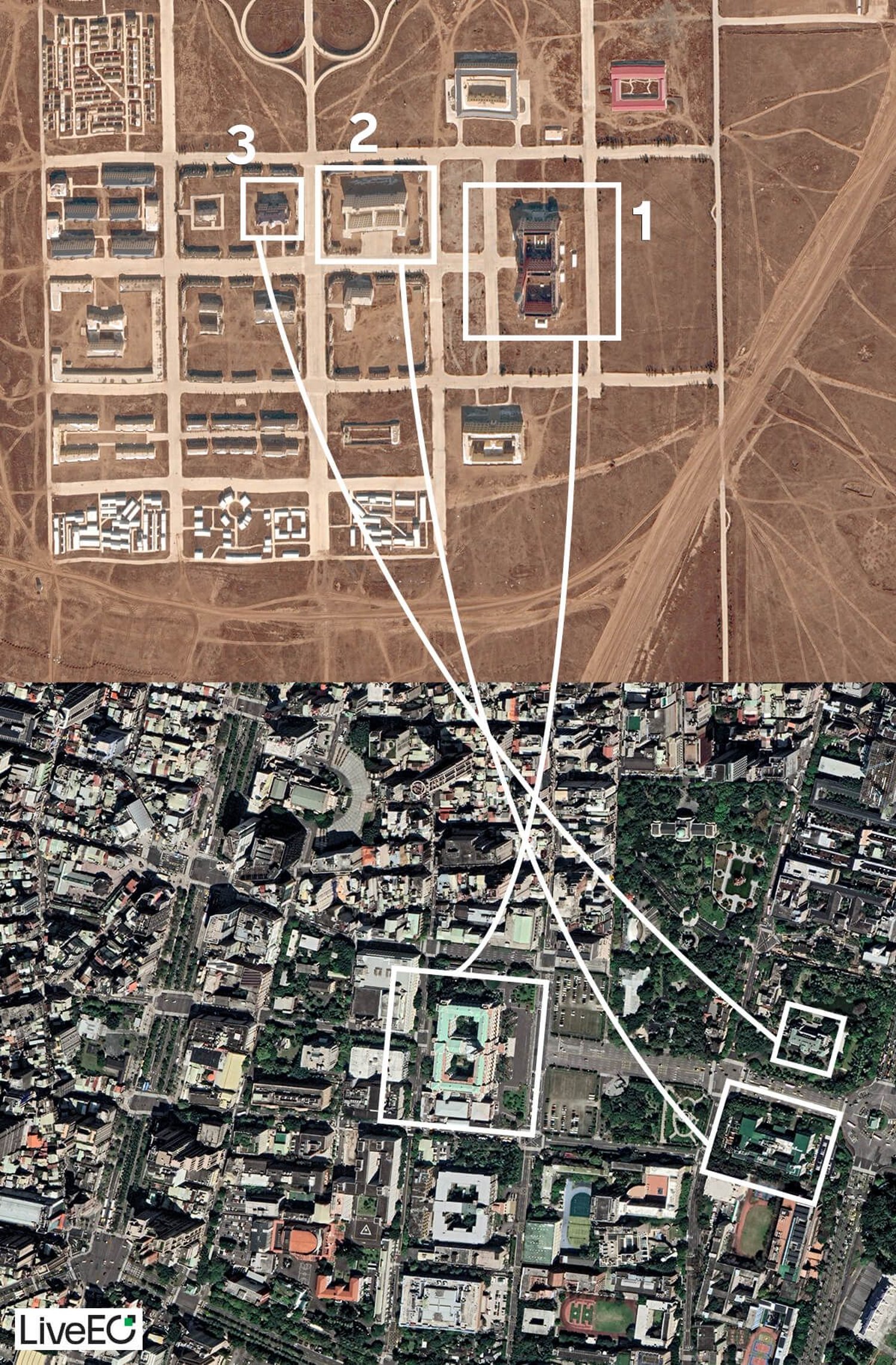 Die auf den ersten Blick etwas unscheinbar und deplatziert in die Landschaft gesetzten Straßenzüge und Gebäude verbergen ein Geheimnis, welches sich erst lüftet, wenn man Taipehs Regierungsviertel aus der Luft betrachtet. Denn die Gebäude in der chinesischen Wüste bei Zhurihe gleichen auffällig denen des taiwanesischen Präsidentenpalastes, des Außenministeriums und des für Staatsgäste genutzten historischen Gästehauses. Die Straßenzüge in Alxa League lassen sich derweil wie ein Abziehbild über das Regierungsviertel legen.