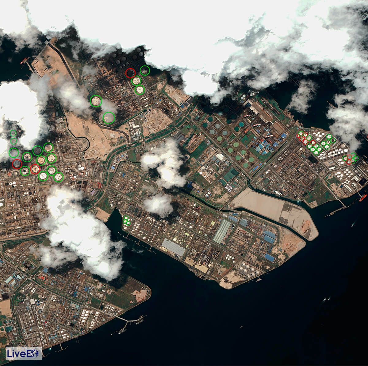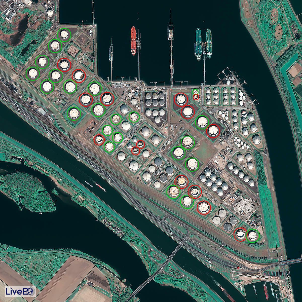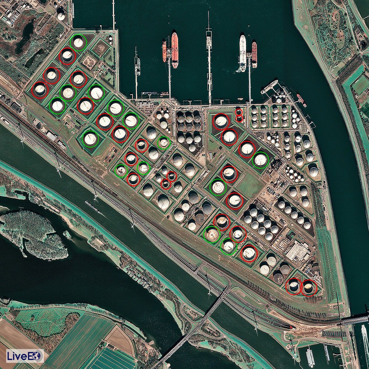Diese Dynamik zeigt sich auch in exklusiven Satellitenaufnahmen von LiveEO von einem Areal im Hafen von Rotterdam. Rohöl oder Ottokraftstoffe lagern die Unternehmen aus Effizienzgründen häufig in Silos mit schwimmenden Deckeln. Der Schattenwurf in ihrem Inneren verrät auf den Satellitenbildern den jeweiligen Pegelstand. Ist das Silo voll, schwimmt der Deckel oben und der Rand wirft demnach auch keinen Schatten. Auf dem Satellitenbild lassen nur 15 der Silos mit Schwimmdach tief blicken, werfen somit einen Schatten und gelten als leer. 38 Rohöltanks sind hingegen voll, das gesamte Areal damit mit über 60 Prozent stark ausgelastet.