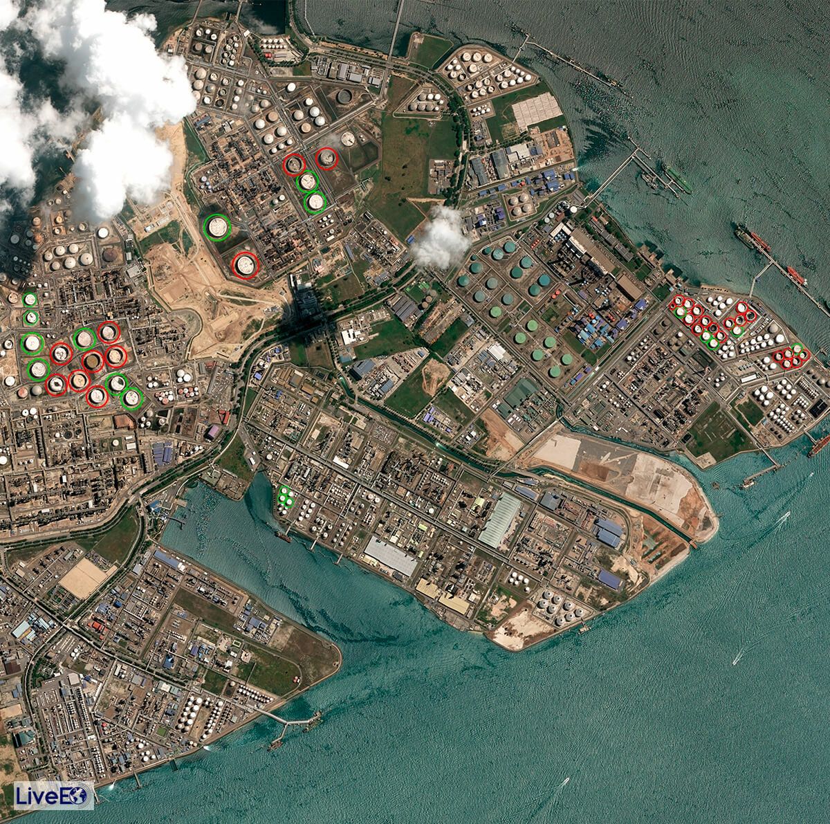 Ein Jahr zuvor sah die Situation noch ganz anders aus. Auf dem rund zwei Quadratkilometer großen Gelände standen nur 14 eher volle und 24 leer beziehungsweise gering befüllte Öltanks. Das entspricht einer Auslastung von nur 36 Prozent.